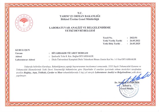 Borsamız Tekın Tekno kentte bulunan Tohum araştırma ve sertifkasyon merkezi Buğday,Arpa,Tritikale,Çavdar ve Mısır Tohumluklarında üç yıl süre ile Laboratuvar analizi ve belgelendirme yetki belgesini Baknlıktan almıştır.